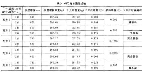 由表3可以看出:經(jīng)海水浸泡后,涂層的重量比未浸泡時增加了,說明涂層吸水了。在3個月劃格撬剝測附著力試驗時,發(fā)現(xiàn)全部用玻璃微珠或全部用云母粉的配方3或配方4做成的涂層在海水里浸泡3個月后,撬剝時涂層完全脫落。這可能與玻璃微珠和云母粉這兩種填料自身的結(jié)構(gòu)有關(guān),對于玻璃微珠這種圓球形結(jié)構(gòu)的填料,由于結(jié)構(gòu)比較單一,在圓球與圓球之間可能會有一些空隙,造成浸泡試驗時海水容易滲透涂層。對于云母粉,雖然它本身是鱗片狀結(jié)構(gòu),在涂層中有防滲水的功能,但是鱗片狀結(jié)構(gòu)不可能完全是平行于涂層表面排列的,如果有些云母粉是垂直于涂層排列的話,那么云母粉的這種鱗片狀結(jié)構(gòu)反而讓水更容易導(dǎo)入涂層中,造成浸泡后涂層脫落。對于配方2,由于配方中不僅有云母粉這種鱗片狀結(jié)構(gòu)的填料還有圓球形的玻璃微珠做填料,在這種復(fù)配的結(jié)構(gòu)中,即使有一些云母粉的鱗片狀結(jié)構(gòu)是垂直于涂層排列的,導(dǎo)入的水會被圓球形的玻璃微珠擋住一部分,因此此配方的涂層浸泡時只有一半脫落。對于配方1這種由沉淀BaSO4、玻璃微珠和云母粉共同復(fù)配做填料的配方,其涂層在海水中浸泡3個月后撬不動,附著力為1級。更驚奇的發(fā)現(xiàn)是,僅用沉淀BaSO4做填料的配方5其涂層在3個月海水浸泡試驗后也撬不動,附著力為1級。這可能是因為沉淀BaSO4多為致密塊狀或板狀、粒狀的集合體,不是單一結(jié)構(gòu),在海水浸泡時這種互相交錯的結(jié)構(gòu)使涂層的阻水性能大大提高。